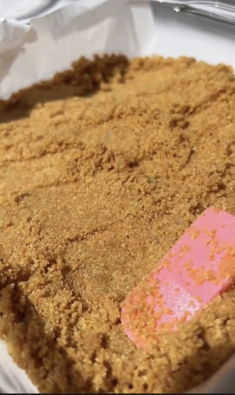 - CRUST: In a small bowl, stir together the graham cracker crumbs, ground pecans, sugar, and cinnamon. Add the melted butter and stir to combine. Make sure all the crumbs are moistened. Press the crumbs into the bottom of the baking pan and bake for 10 minutes. Remove from oven, leave the oven on.