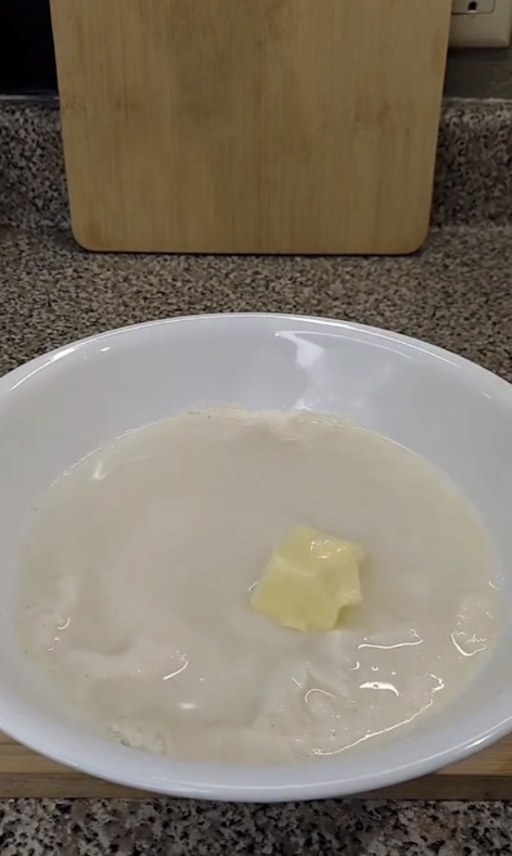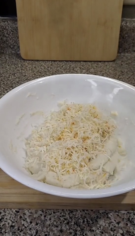 Then add about 2.5 cups of milk (you can also use water). Throw in a couple of good pinches of salt, you don’t need to go overboard here, but enough to taste. Next add about 1.5 cups of Mozzarella cheese. (this is the most important ingredient)