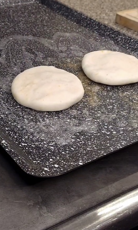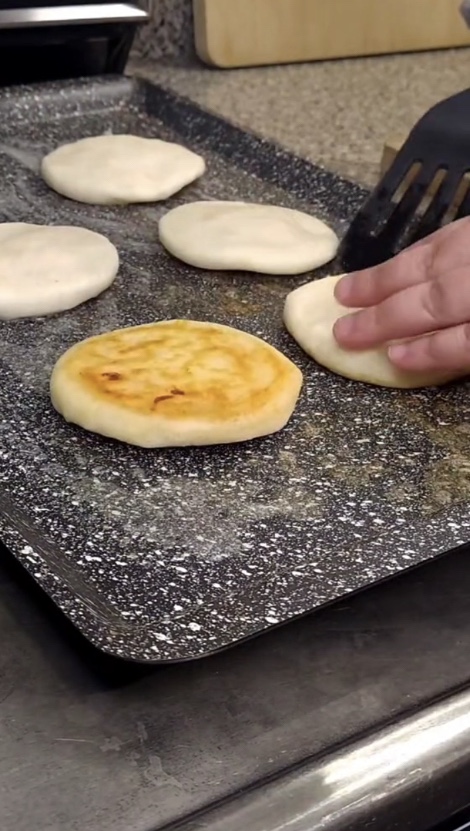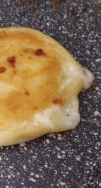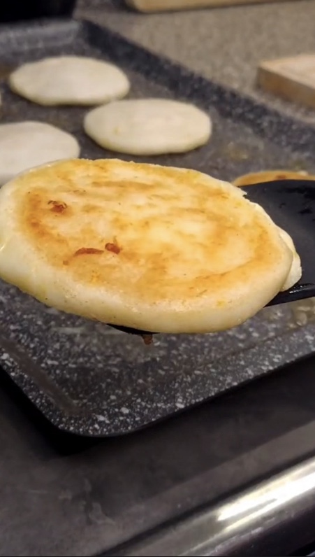 Take a spatula and check occasionally for black specks like above, that is the cheese mixed in with the dough. Flip it occasionally and add salt to the unsalted side, you can re-butter the griddle also. You will know it is done when melted cheese starts to break through the wall off the Arepa and ooze out. Just make sure they are not burning before that happens. If so, lower the heat a bit. Cooking should take anywhere form 10-15 minutes, about half for each side.