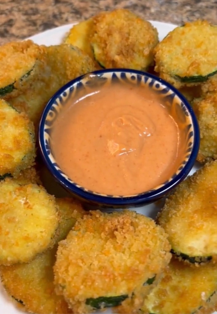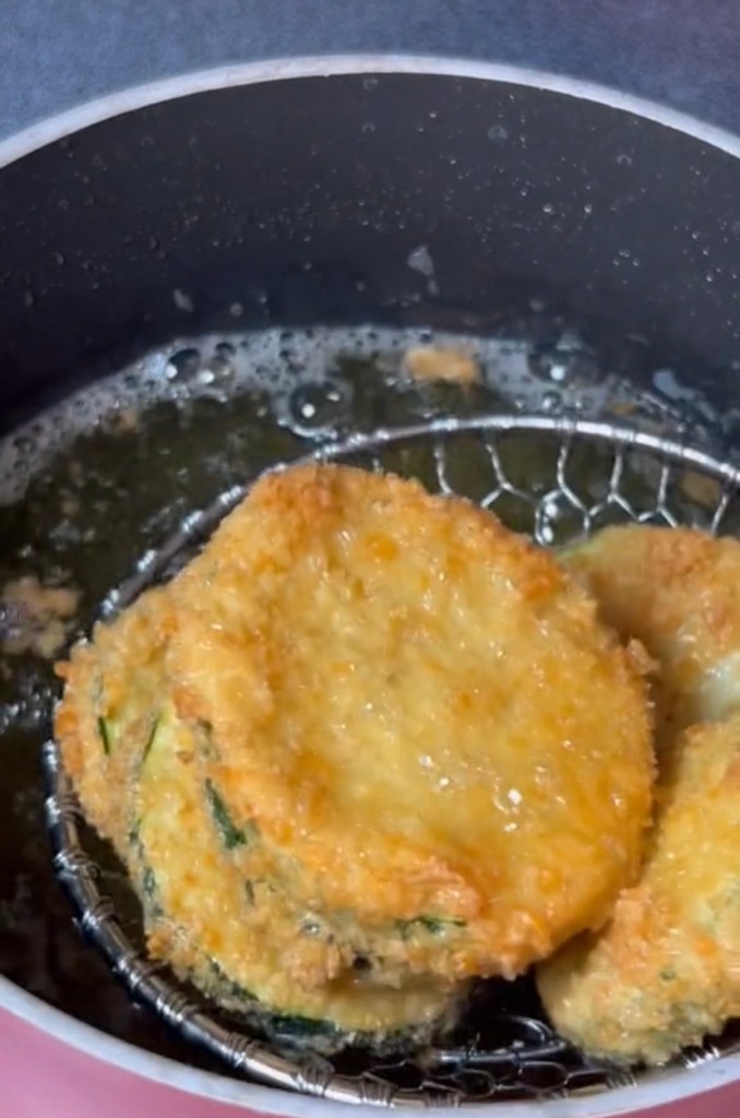 3.When the oil is hot, working in batches, fry the zucchini rounds until they are golden brown, about 3 minutes. Using a slotted spoon, transfer the fried zucchini to paper towels and drain.