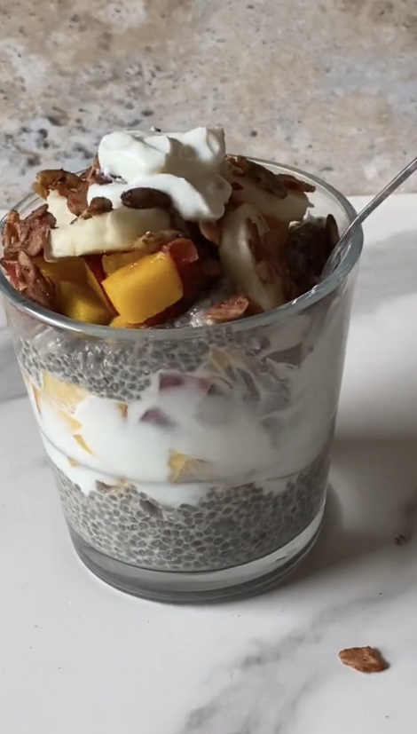- Add half of chia seed mixture to the bottom of a glass then layer on some sliced peaches , Greek yogurt, bananas , keep repeating the layers , top with some honey and bits of your choice and there you have a healthy delicious parfait!