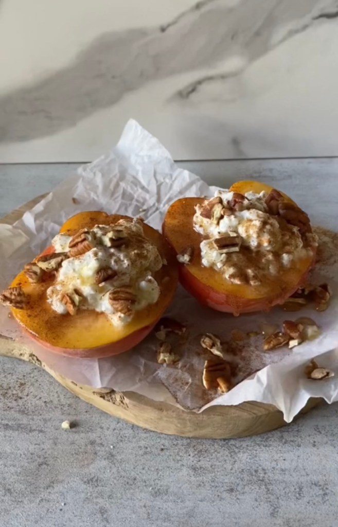Cut your peach in half , take out the pit and add a spoonful of cottage cheese or Greek yogurt , drizzle on some honey , sprinkle some cinnamon and top with your favorite nuts , pecans , almonds , hazelnuts, then dive in an enjoy!!