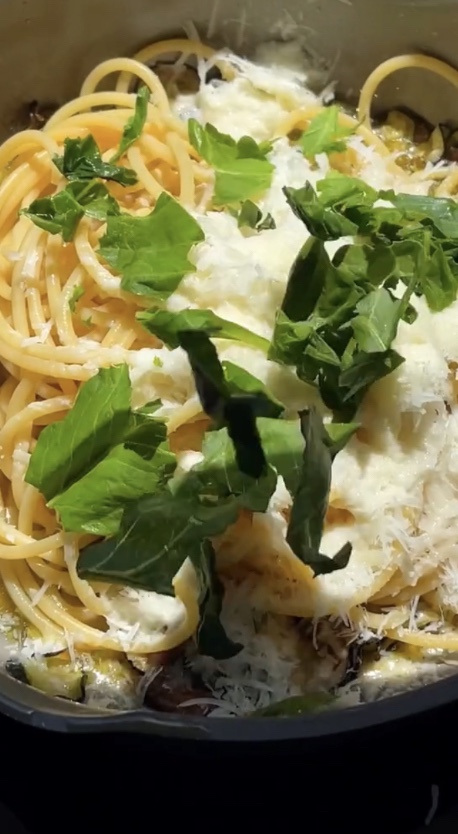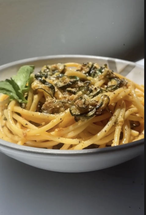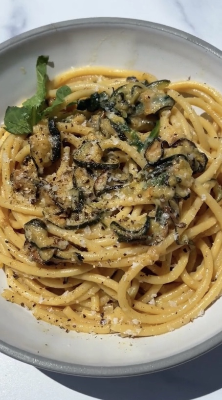 Place spaghetti on a serving plate. Top with the remaining zucchini, a little bit of pepper, and more grated parmigiano. And there you go, your spaghetti alla Nerano is ready to be enjoyed