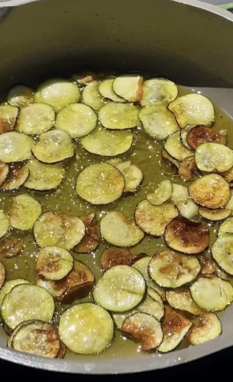 In a frying pan heat a good amount of extra virgin olive oil over medium heat and fry zucchini until slightly browned