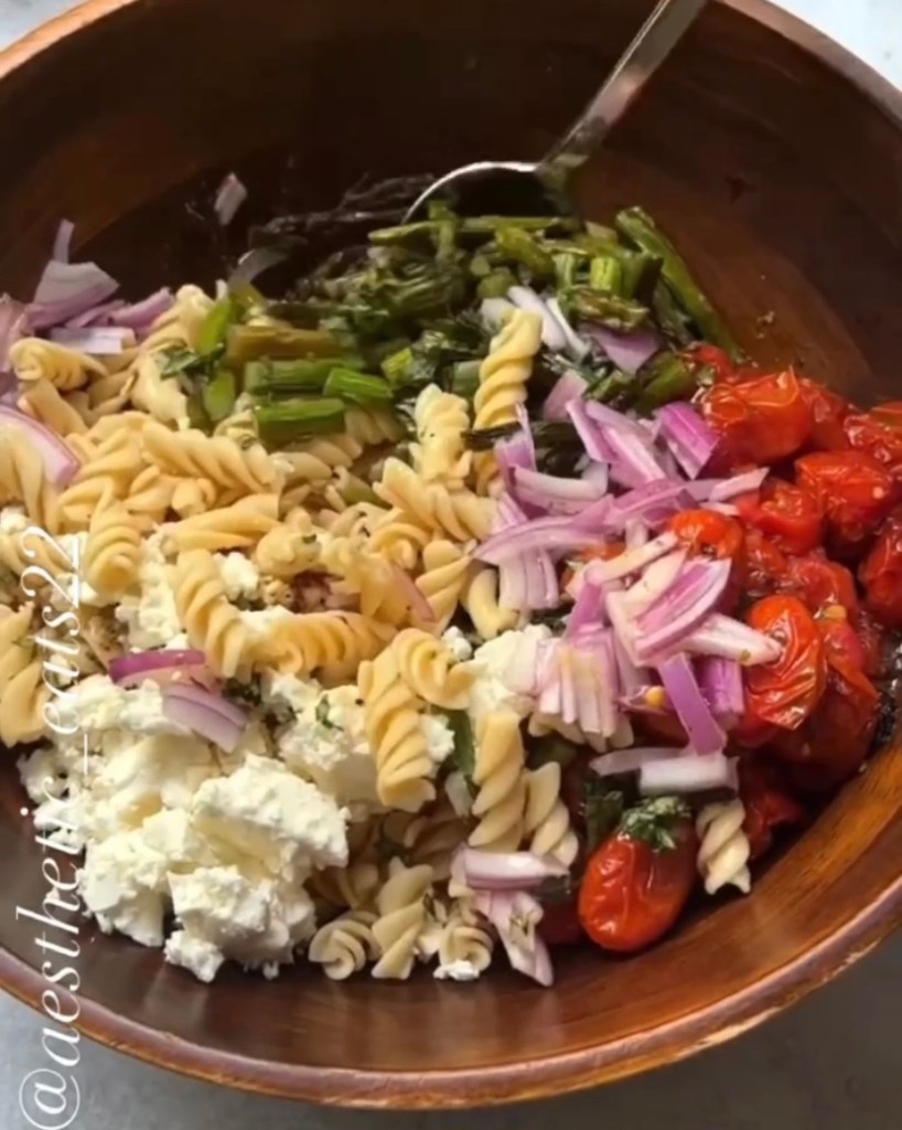 Add cooled pasta to a bowl along with asparagus, tomatoes, red onion, feta, and basil. Toss in the dressing, taste, and season with salt and pepper if needed.