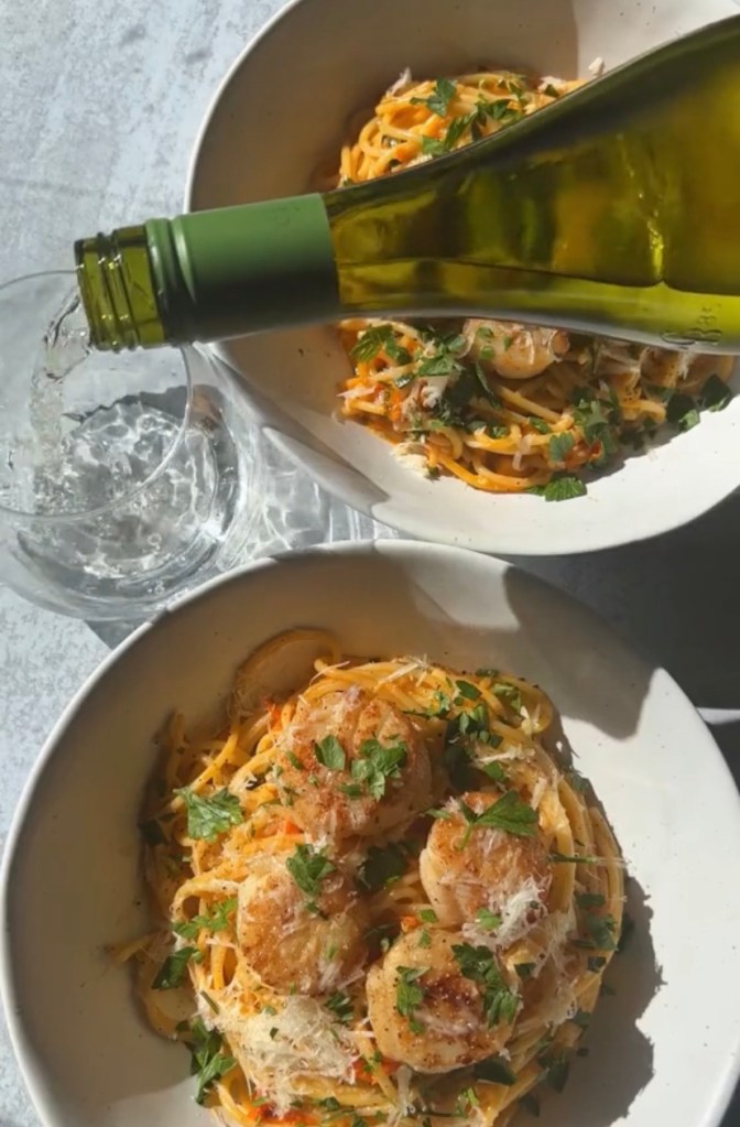In a separate skillet, heat up remaining 1 tbsp butter on medium high heat. Pat scallops dry and season with salt and pepper. Cook scallops for around 2 minutes on each side or until they’re golden brown and crisp on each side. Plate your pasta and top with scallops and more Asiago and parsley.