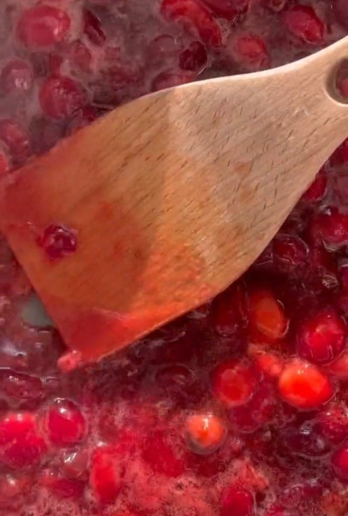 Reduce heat to a simmer and continue to cook cranberries, stirring occasionally, 10-15 minutes or until all or most berries have burst (careful, there is some splatter) and the mixture is slightly reduced. The longer you cook your cranberries the thicker your mixture will be, but it will also thicken up after standing.